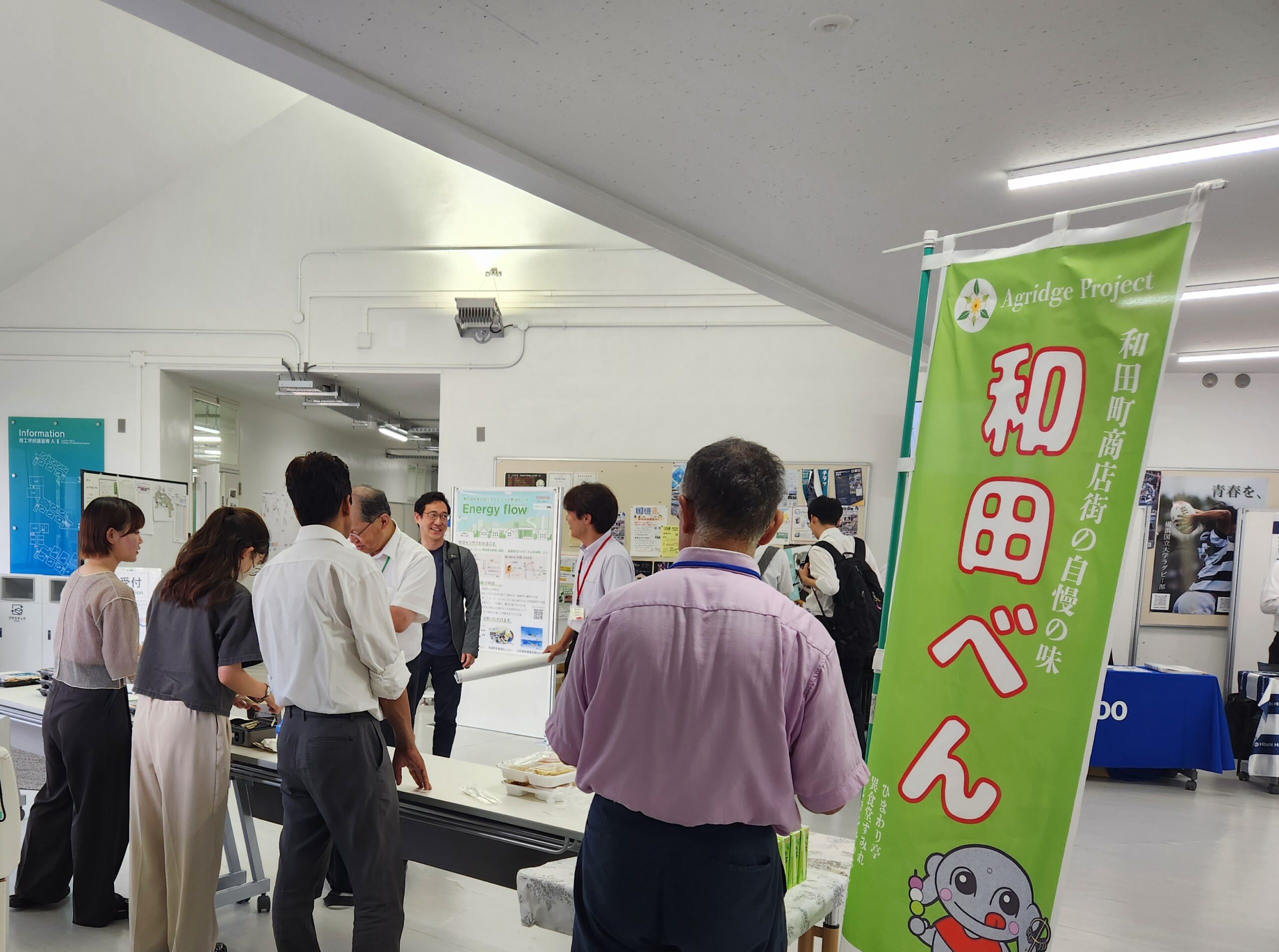 本討論会では特色のある取り組みが複数行われています。まず、昼食弁当については、「和田べん」と名付けられた、横浜国立大学近隣の、和田町商店街の店舗による手作り弁当を採用しました。横浜国立大学の学生団体(アグリッジプロジェクト)と和田町商店街が協力し、学生が育てた農作物を利用して商店街の飲食店が作ったお弁当を、大学で販売するという活動が約20年継続しています。この活動で作られる「和田べん」を、本討論会のために特注し、地産地消に貢献しました。さらに食品ロスをなくすため、事前に学会参加者から弁当の予約有無をヒアリングし、発注個数の調整をしました。